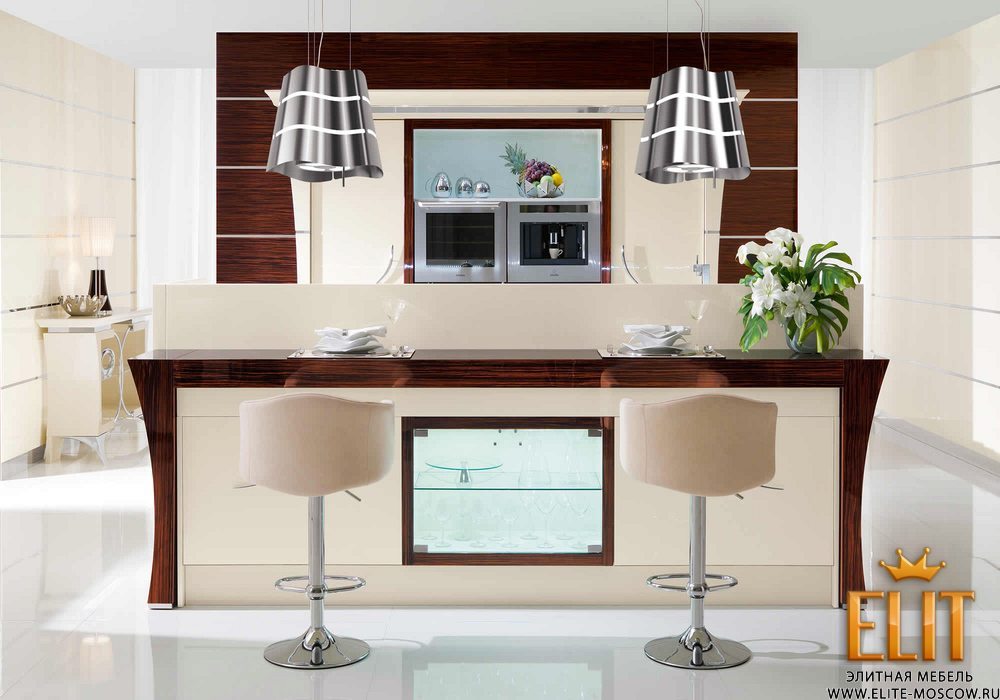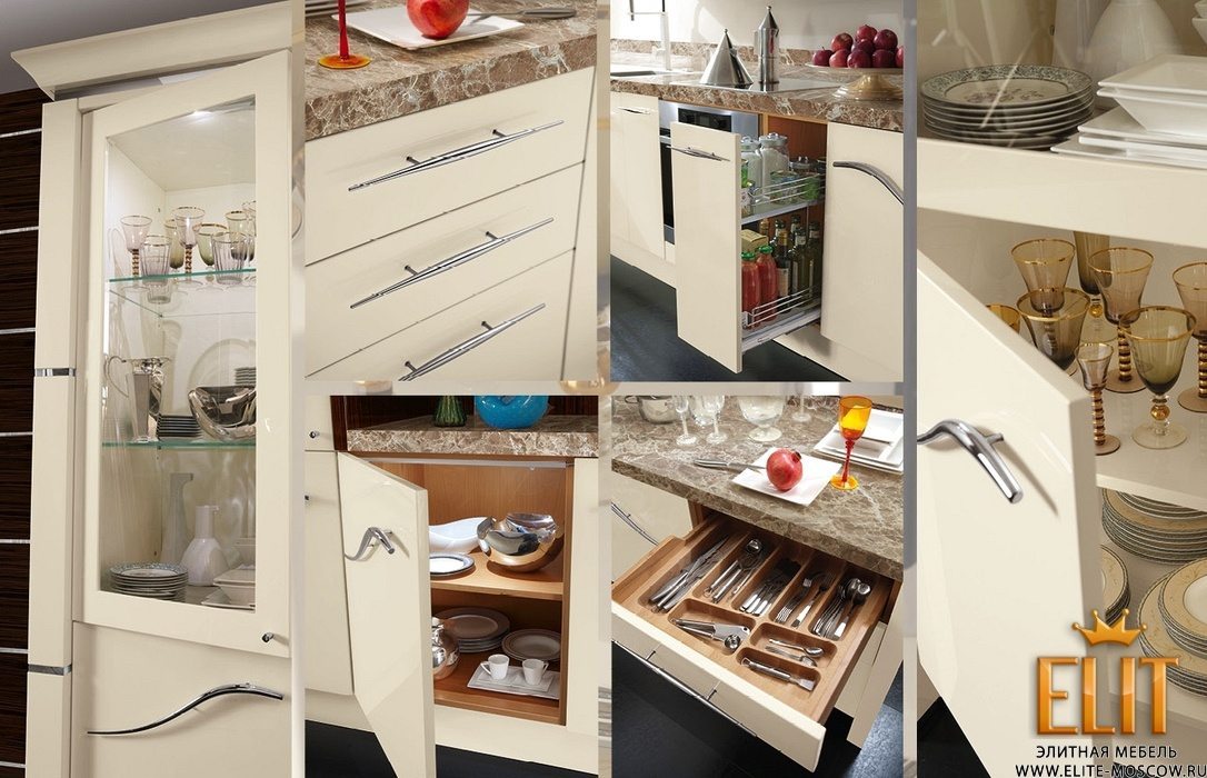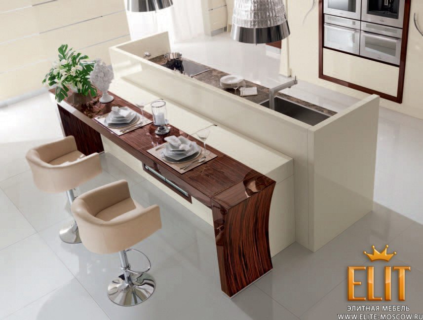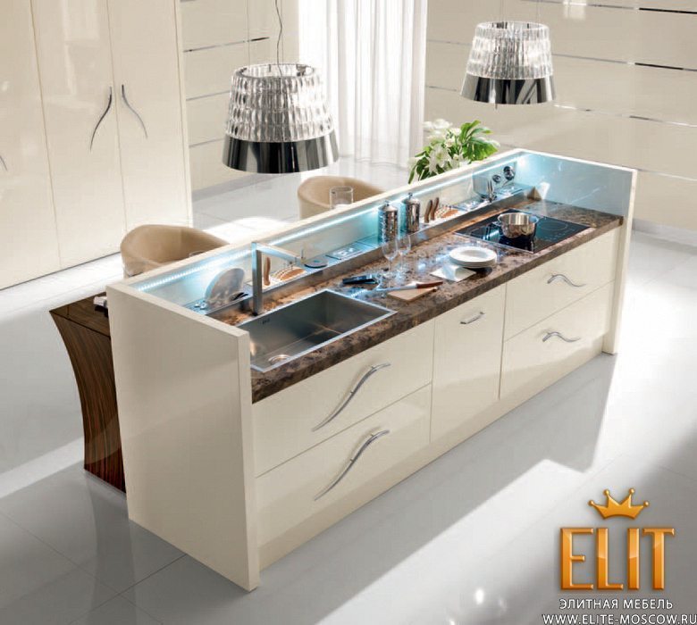 Итальянские кухни фабрики REDECO – это роскошная коллекция современной мебели, которая характеризуется многофункциональностью, гармонично сочетающаяся с изысканным дизайном. Каждый элемент коллекции привлекает к себе внимание тщательным и детальным исполнением. Вся продукция, представленная фабрикой для обустройства кухни, выполнена из массива ценных пород деревьев, основываясь на традиционных и современных техниках производства. С первого взгляда даже трудно понять, что перед нами кухня, так как вся техника и кухонные принадлежности полностью скрыты. Техника, расположенная в шкафу, который напоминает витрину или барный шкаф, а кухонный остров соединен с барной стойкой. Бар оснащен также подвижной столешницей, а мебель – освещением. Настенные панели со стальными вставками являются весьма выигрышными элементами в интерьере, который является удачным фоном для кухонной мебели, представленной в бежевом лаке. Кухня оснащена ящичками, полочками, встроенными тумбами для максимального удобства пользования. Продукция характеризуется высоким качеством изготовления, отменной функциональностью, надежностью, прочностью и практичностью. Для отделки мебели мастера используют лаковое покрытие с использованием глиттера (декоративные мелкие блестки), что придает бриллиантовый блеск лакировке и особый лоск мебели, подчеркивая ее уникальность и значимость. Также используется эбен и шпон зебрано, декоративные элементы из хромированной латуни сплавом из 70% хрома и 30% серебра, натуральная кожа для обивки кресел, мрамор и стекло. Все элементы декора вместе с эффектным дизайном каждой модели создают единый и неповторимый образ роскошной и многофункциональной кухни REDECO.