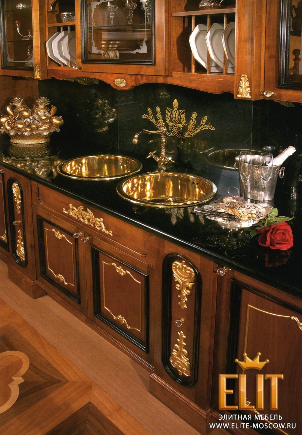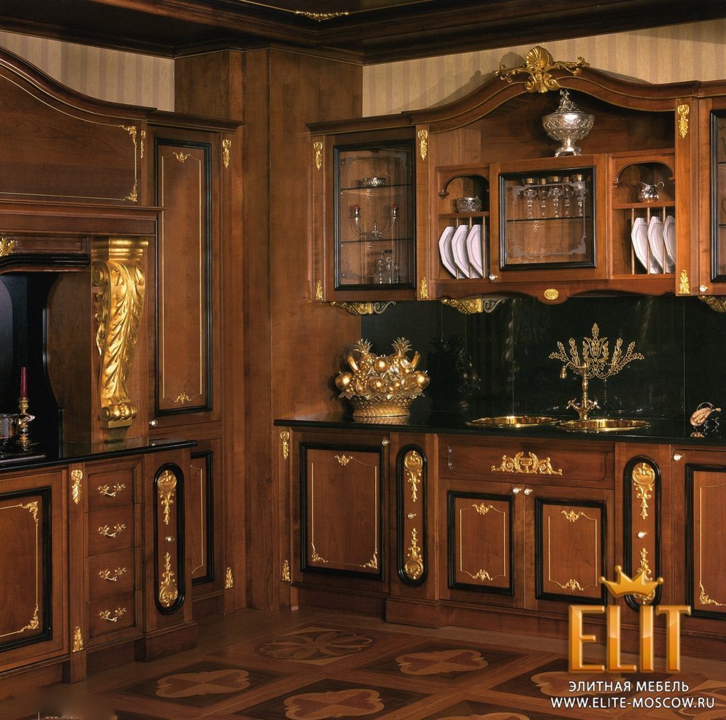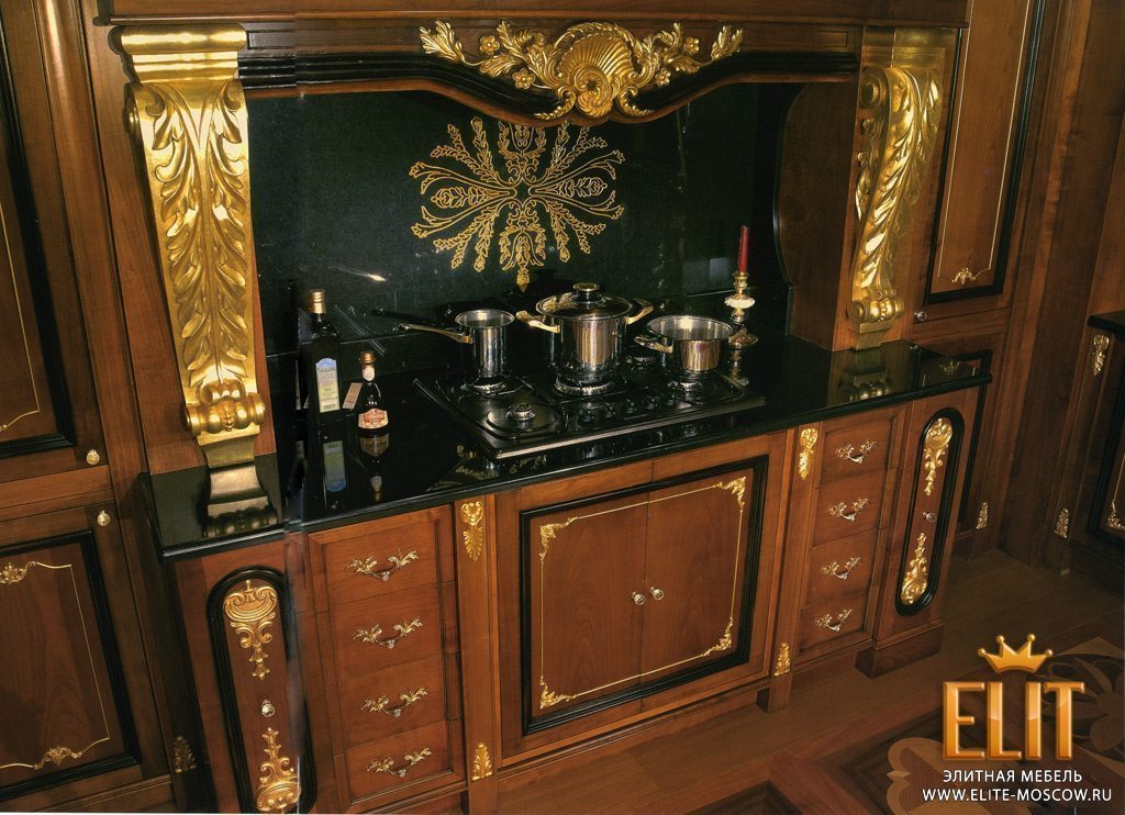 Великолепная итальянская мебель для кухни серии IMPERIAL выполнена из ценных пород дерева, которые качественно обработаны по специальным технологиям. Опытные мастера-ремесленники с особым вниманием отнеслись к исполнению каждой детали мебели. Ручная работа, резьба по дереву и эксклюзивная отделка тому подтверждение. Цветовая комбинация основного материала – дерева, темной столешницы и золотой отделки заставляет надолго задержаться взглядом на мебели. Особое великолепие мебели IMPERIAL придает, конечно же, отделка золотом: золотая фурнитура, эксклюзивные аксессуары, благодаря которым мебель выглядит невероятно красиво и благородно, а при лучах света добавляет блеск помещению своим прекрасным декором. Мебель IMPERIAL достойна внимания и восхищения, это настоящее произведение искусства.